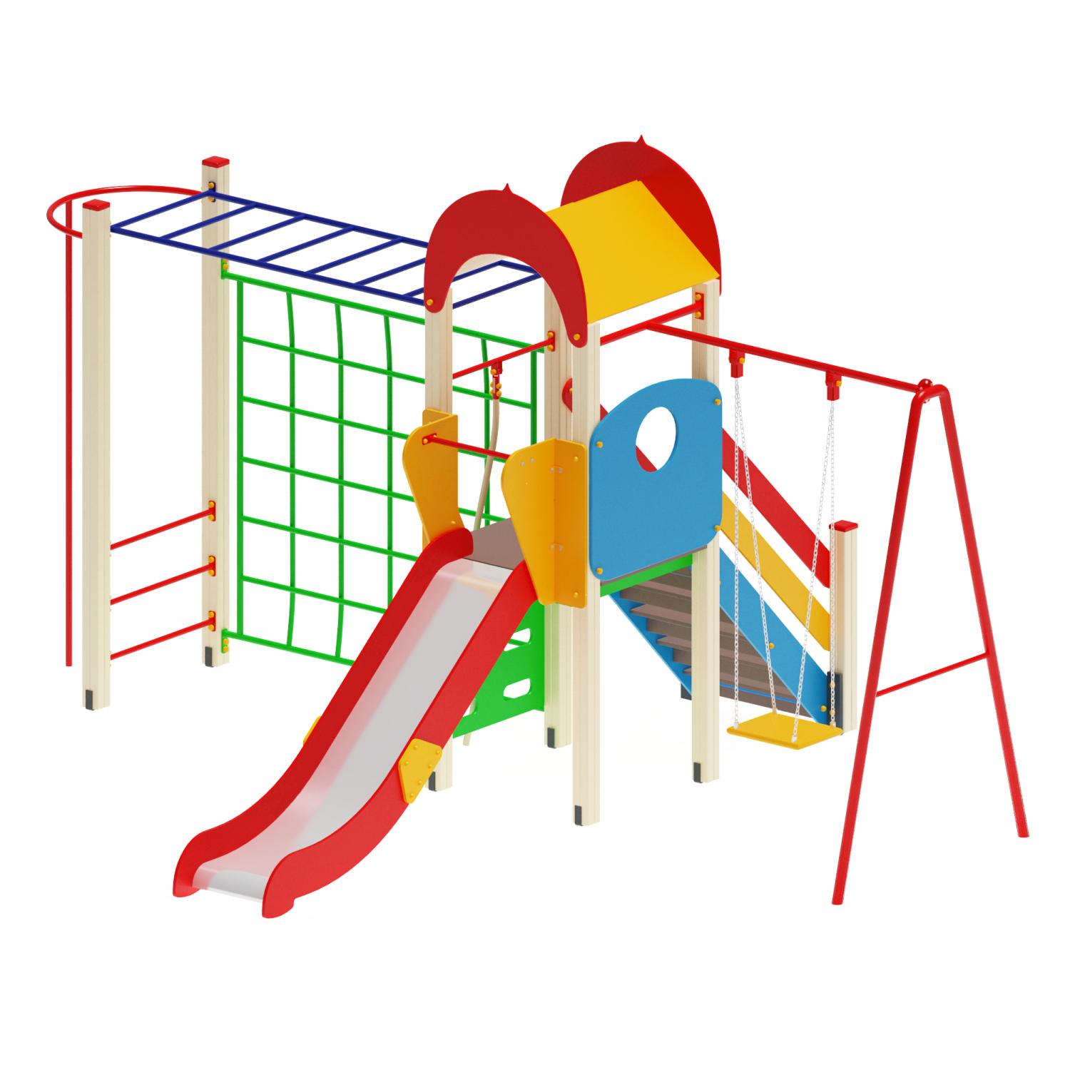 Горка (1 шт.) Скат горки имеет ширину 530 мм и выполнен из нержавеющей стали толщиной 1,5 мм в виде цельного листа, утопленного в паз бортиков горки. Борта изготовлены из влагостойкой фанеры толщиной 24 мм шириной не менее 150 мм. Опорный каркас горки выполнен из профиля 40×25 и труб диаметром 33 мм. Стартовая площадка горки ограждена стальной перекладиной из трубы диаметром 27 мм, установленной на высоте не менее 600 мм от уровня поверхности стартового участка горки. Общий размер горки в плане составляет 530×2170×1200 мм.